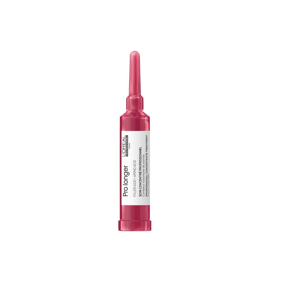 Potenciado por Filler-A100 y aminoácidos, el concentrado Pro Longer rellenador de puntas de una dósis es el tratamiento para el cabello largo con puntas adelgazadas. Gracias a la alta concentración de la molécula patentada Filler-A100, esta disruptiva fórmula profesional proporciona instantáneamente fuerza y grosor duradero a las puntas. Cuando se usa con el shampoo y mascarilla Pro Longer para cabello largo, hay una reducción del 59% de la quiebre del cabello* y las puntas abiertas se reducen visiblemente en un 66%* La tecnología Filler A-100 está patentada por L’Oréal Professionnel y actúa penetrando el núcleo de la fibra para dar volumen y engrosar el cabello desde el interior. Los aminoácidos en la fórmula trabajan para fortalecer el cabello desde el exterior.