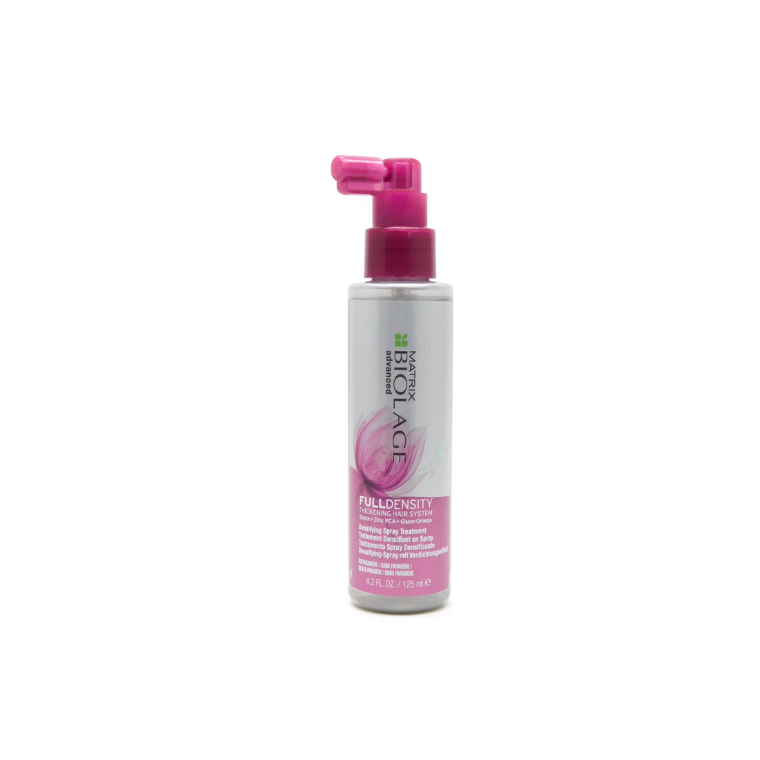 BIOLAGE FULLDENSITY Densifying Spray Treatment funciona en la superficie de las hebras existentes para expandir el diámetro del cabello y dar una sensación de grosor después de la primera aplicación .